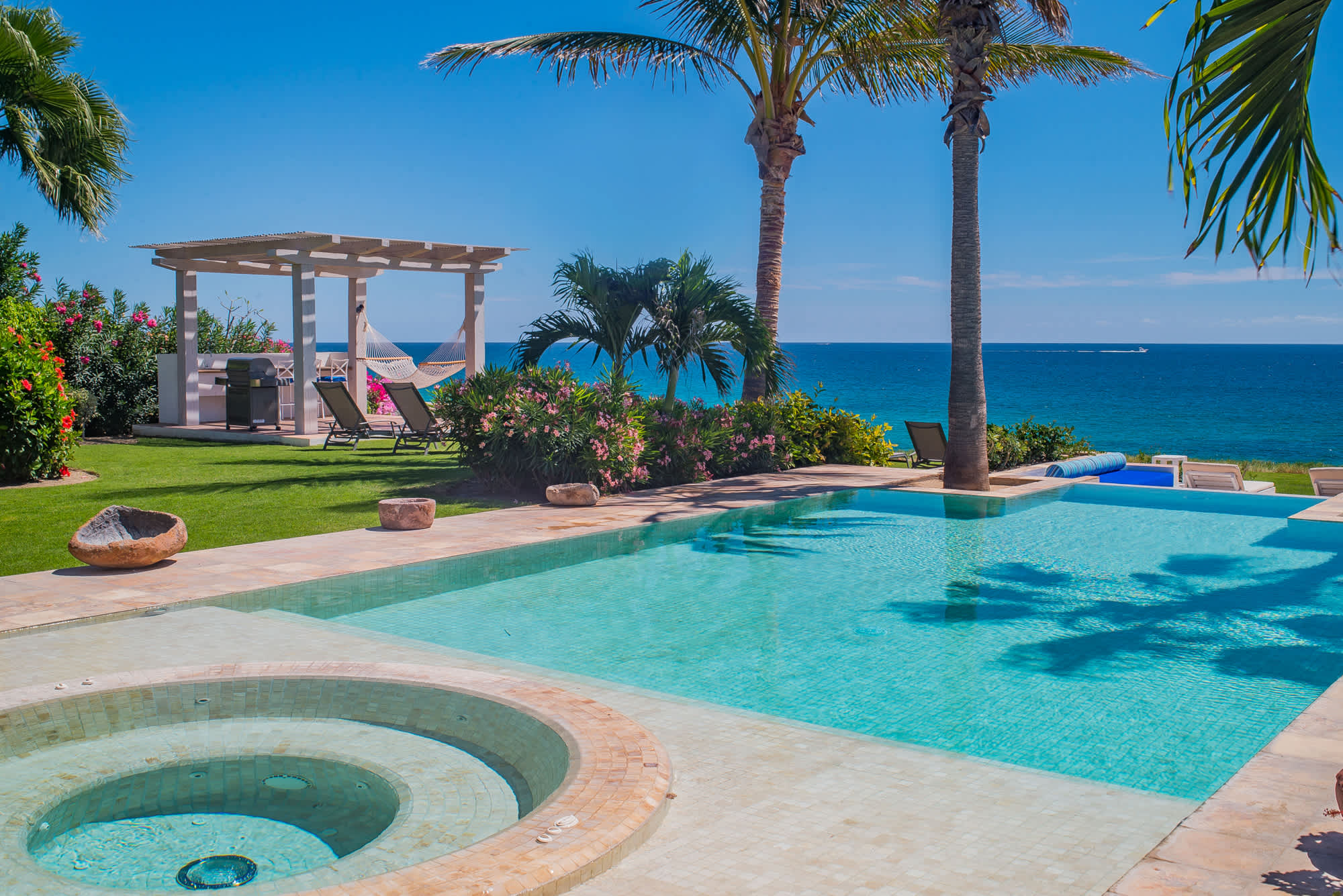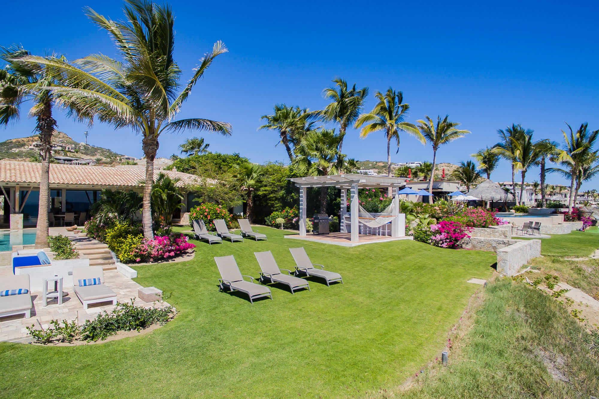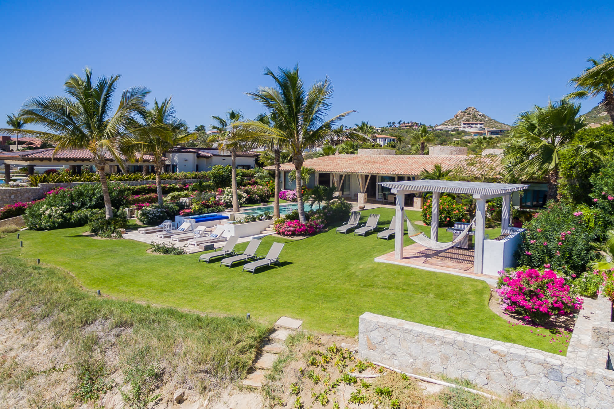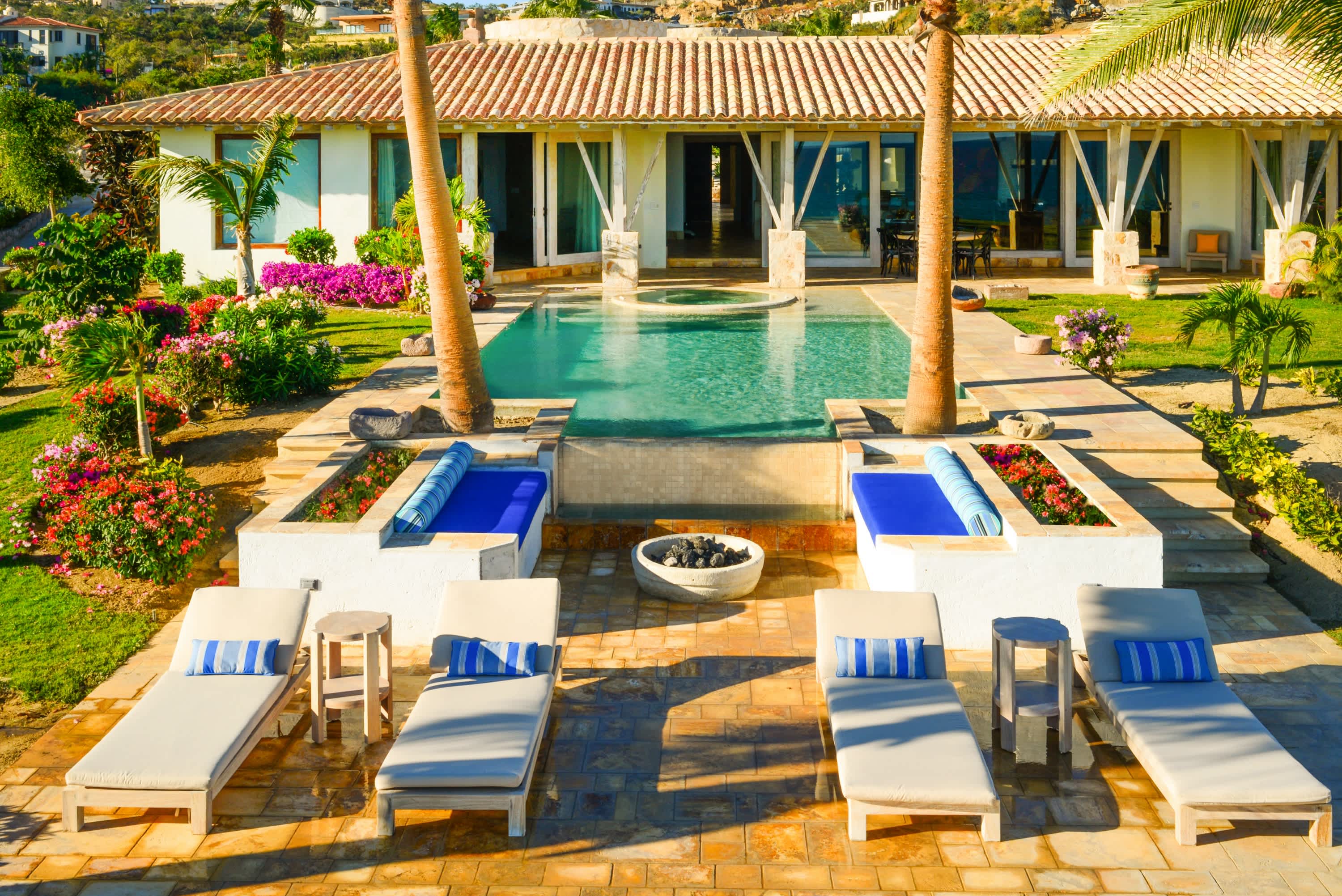 The classic Hacienda aesthetic unfolds onto a magnificent terrace, where exotic tropical gardens frame a private infinity pool and jacuzzi. Here, every detail is designed for your indulgence—offering a sanctuary of peace where the desert meets the sea.