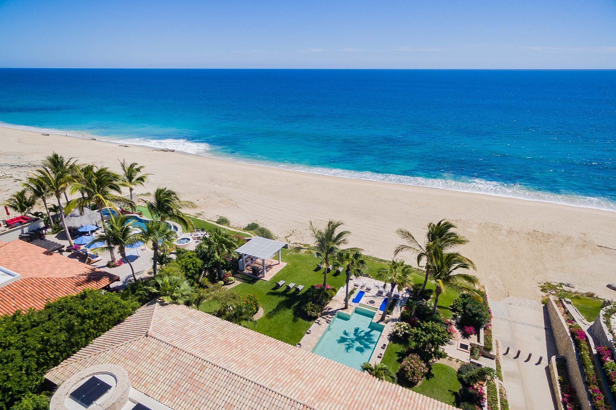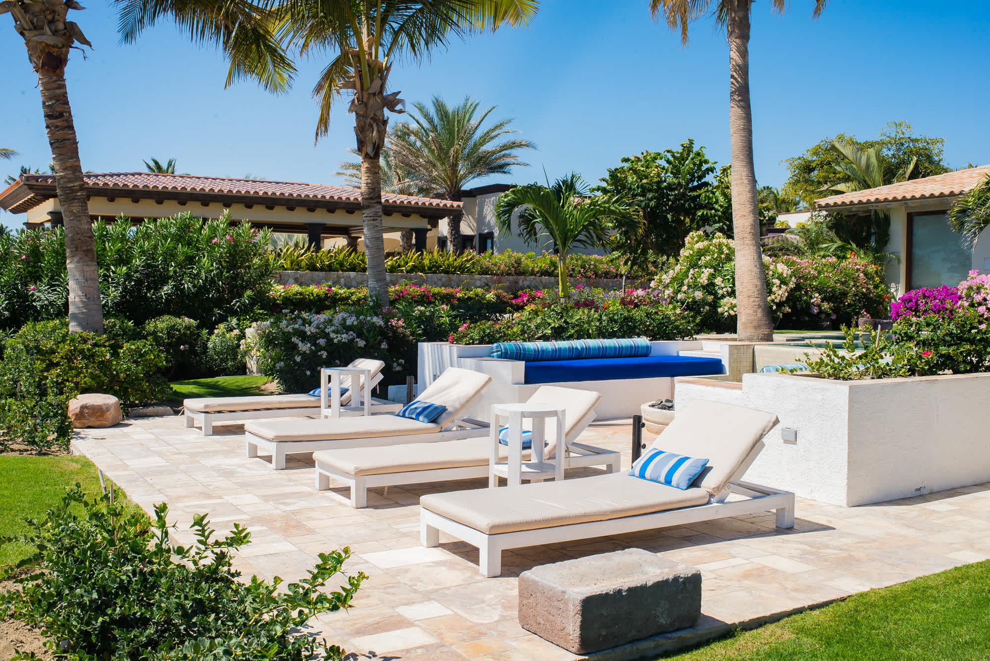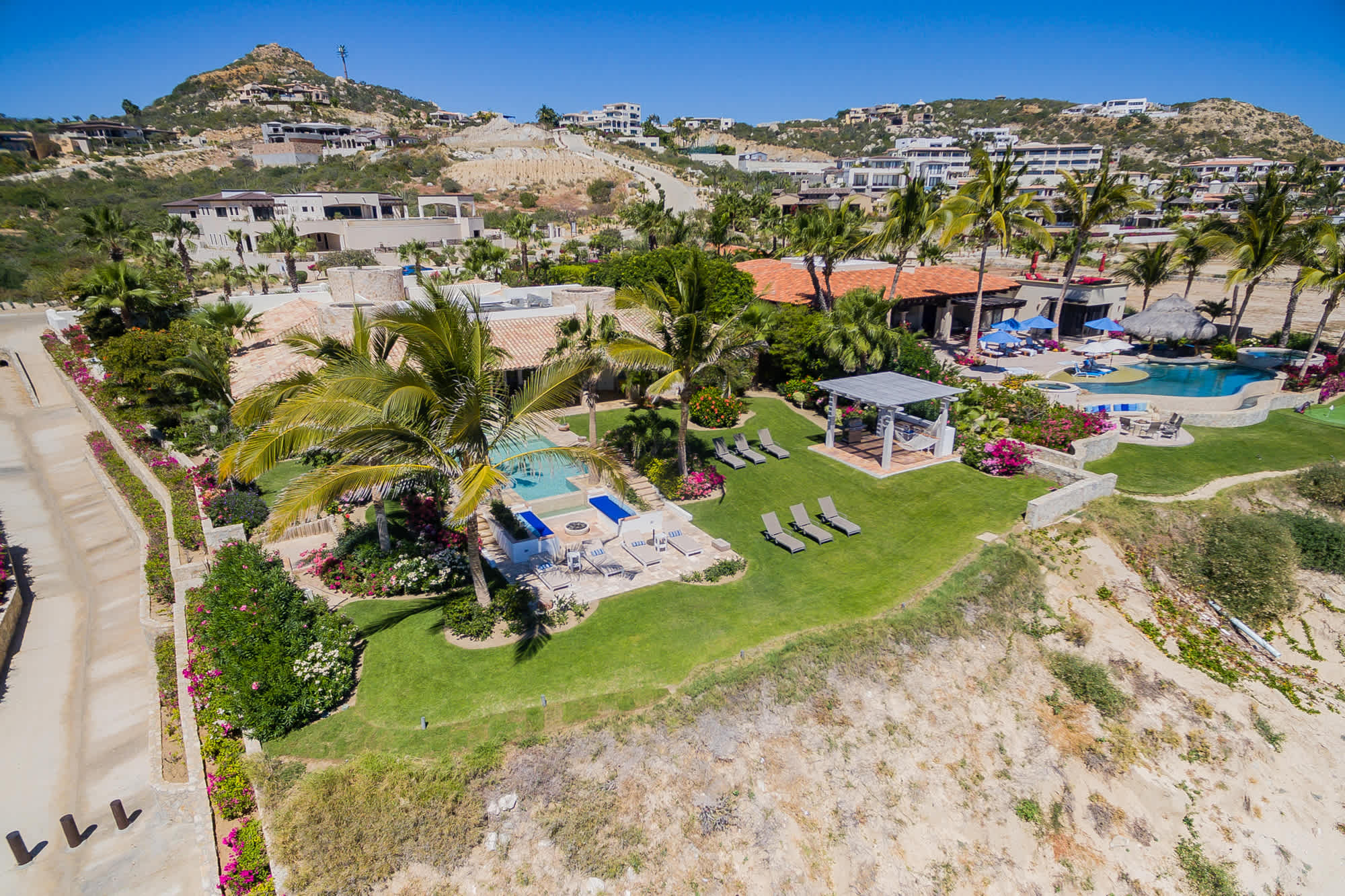 The classic Hacienda aesthetic unfolds onto a magnificent terrace, where exotic tropical gardens frame a private infinity pool and jacuzzi. Here, every detail is designed for your indulgence—offering a sanctuary of peace where the desert meets the sea.