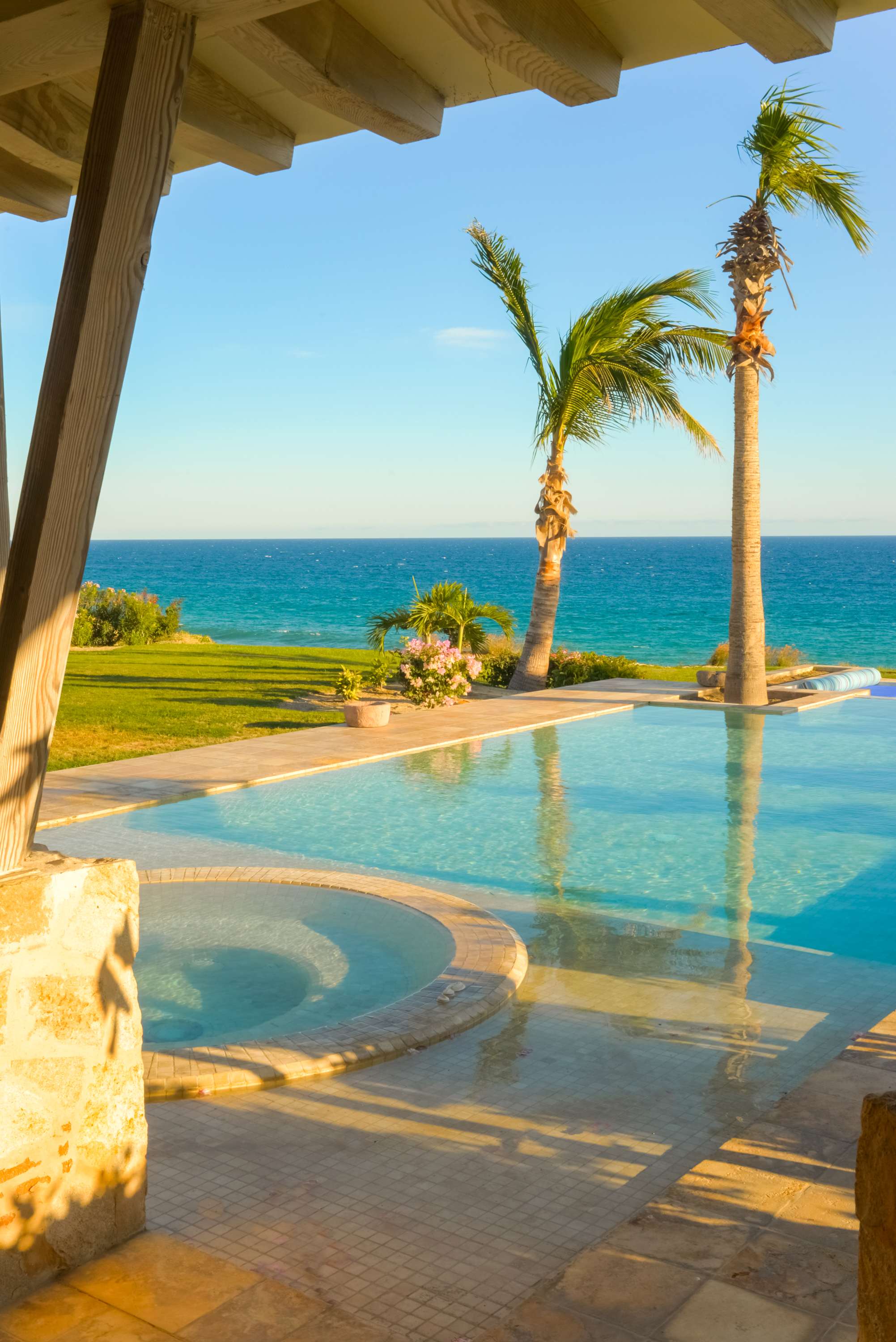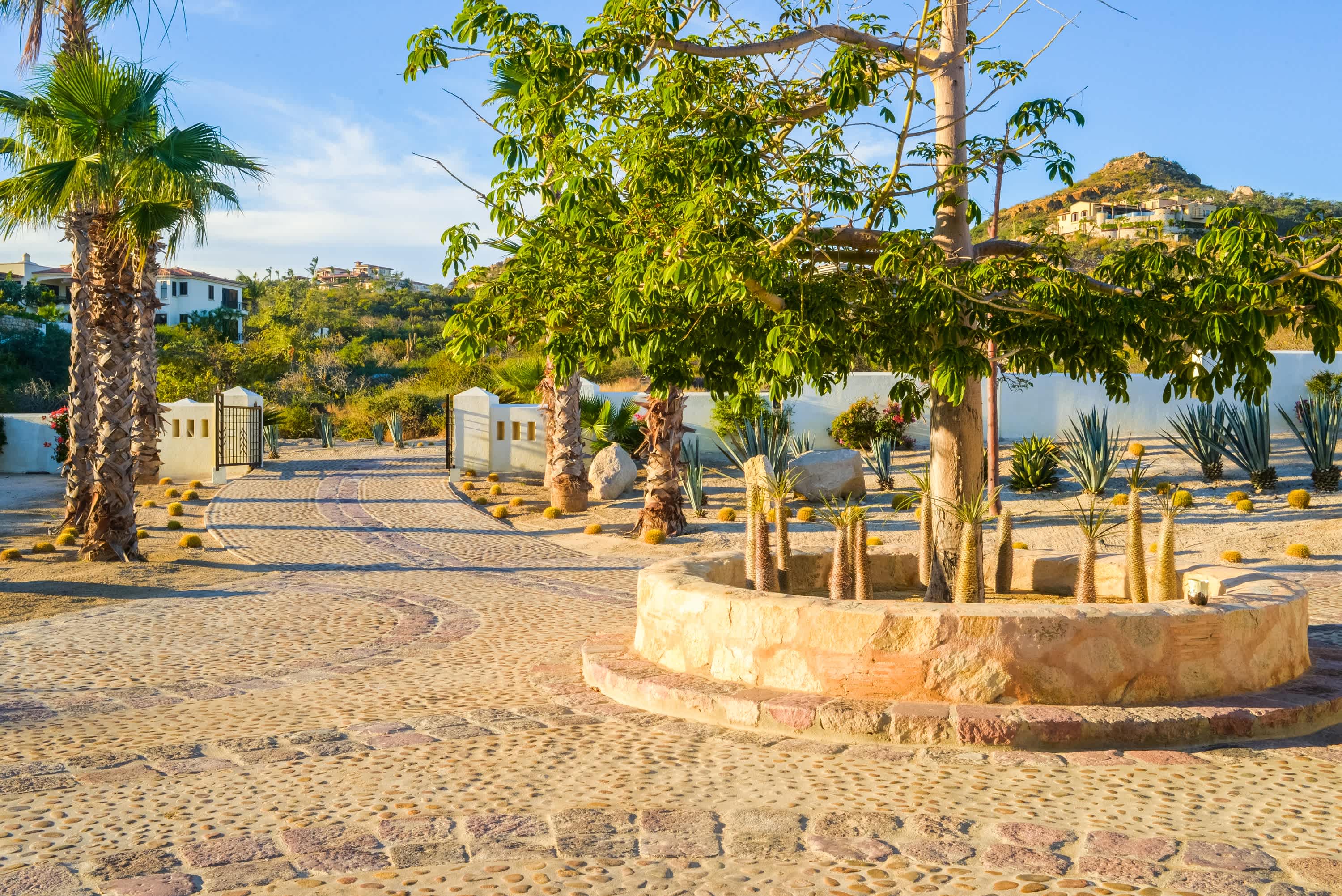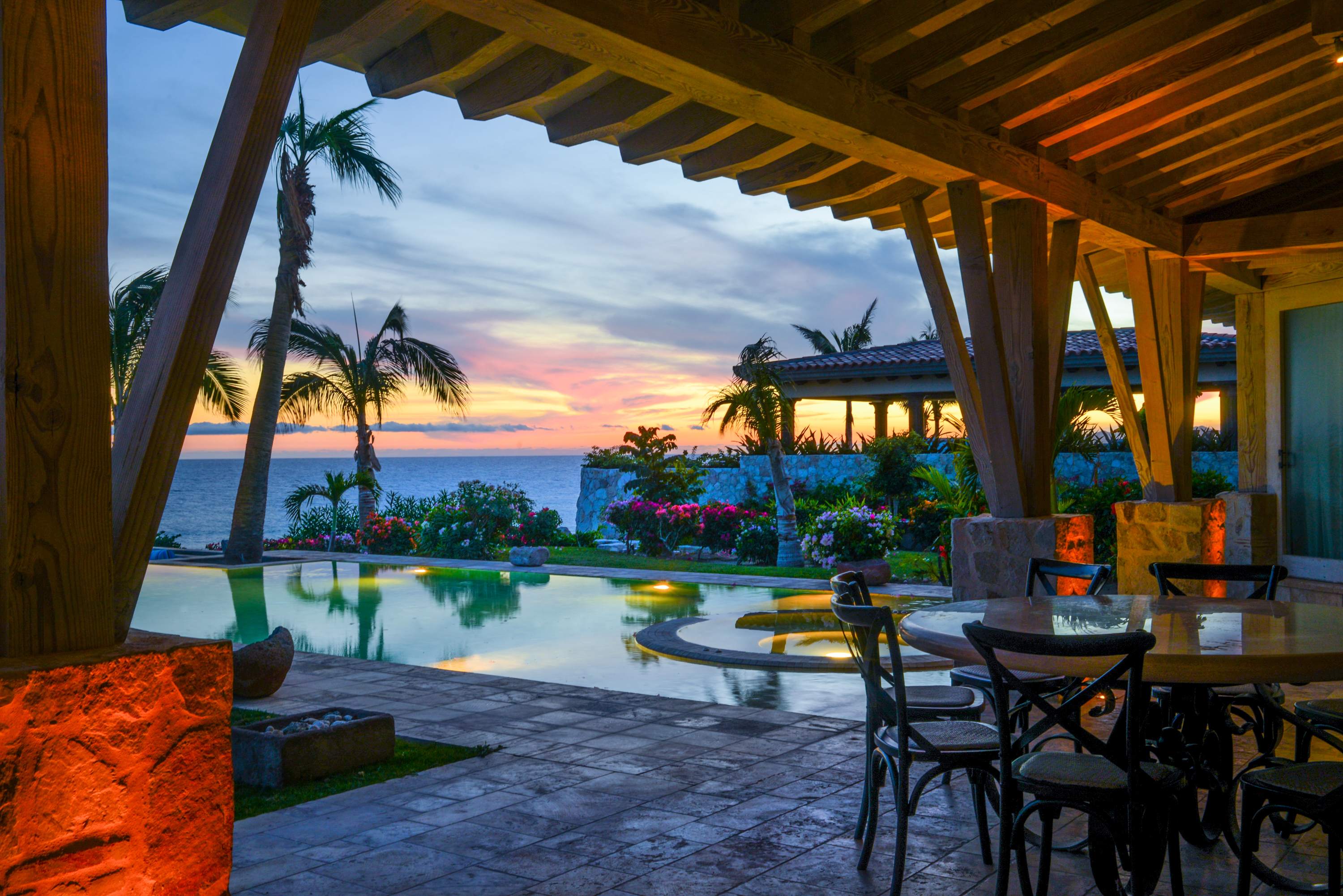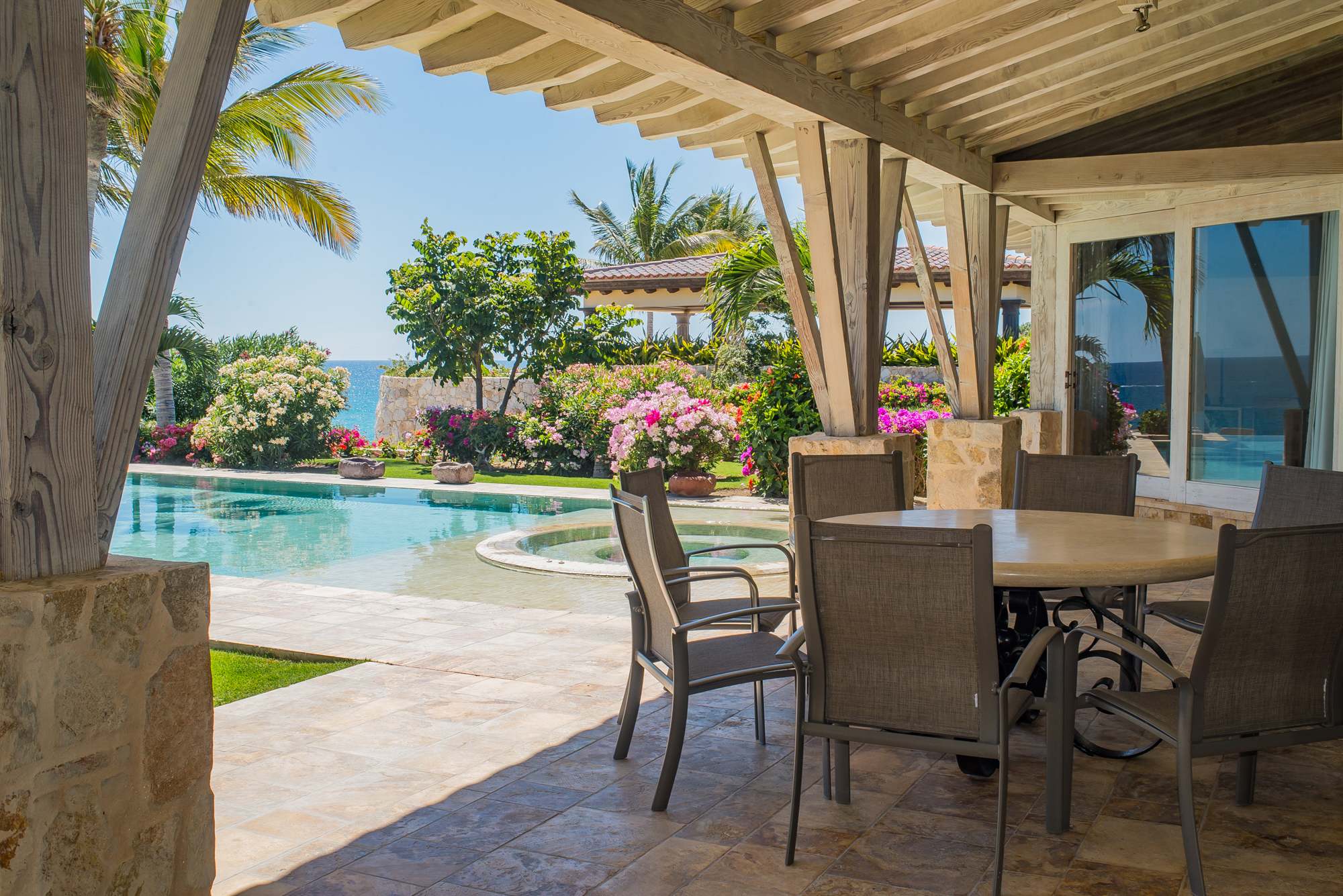 The classic Hacienda aesthetic unfolds onto a magnificent terrace, where exotic tropical gardens frame a private infinity pool and jacuzzi. Here, every detail is designed for your indulgence—offering a sanctuary of peace where the desert meets the sea.