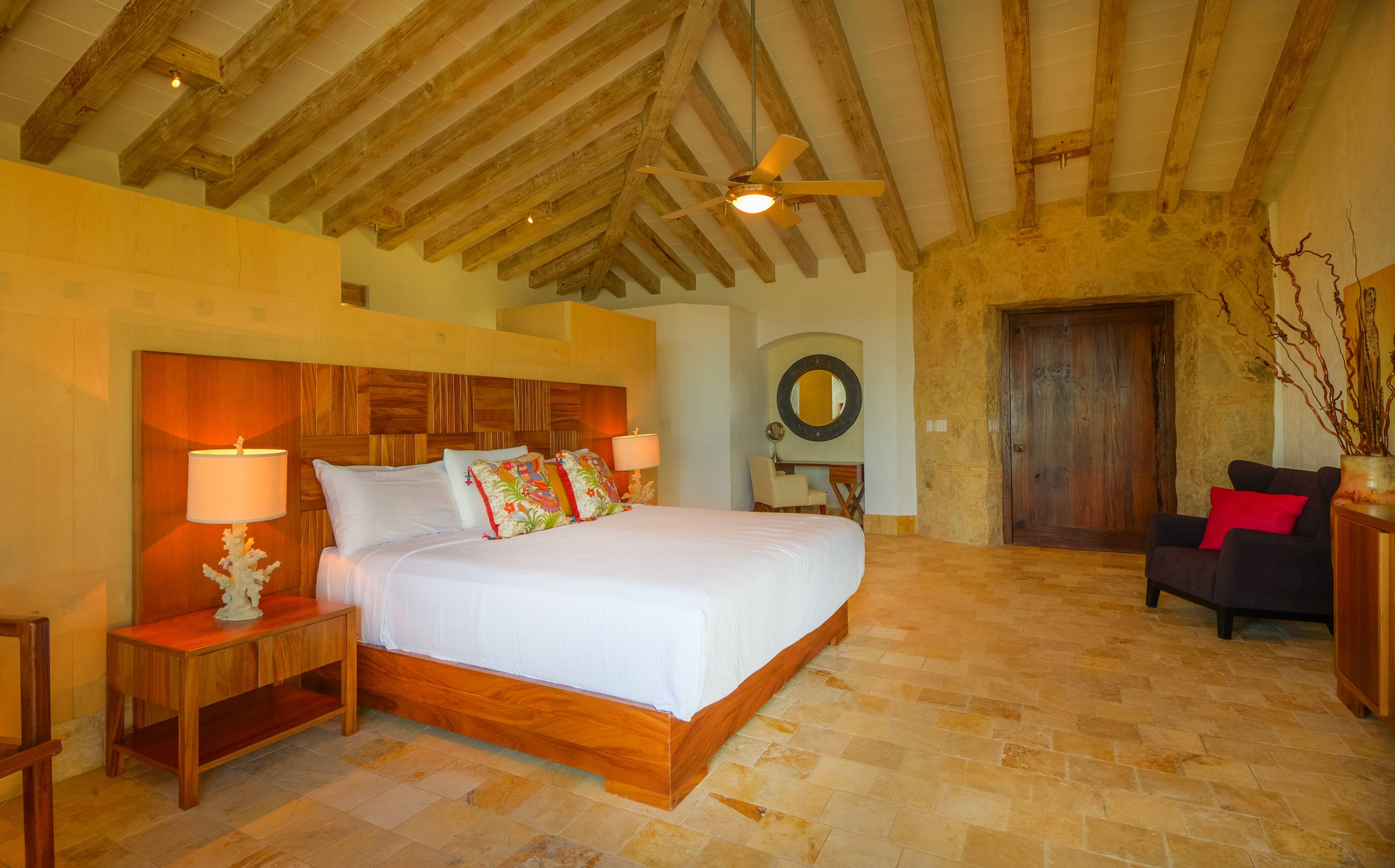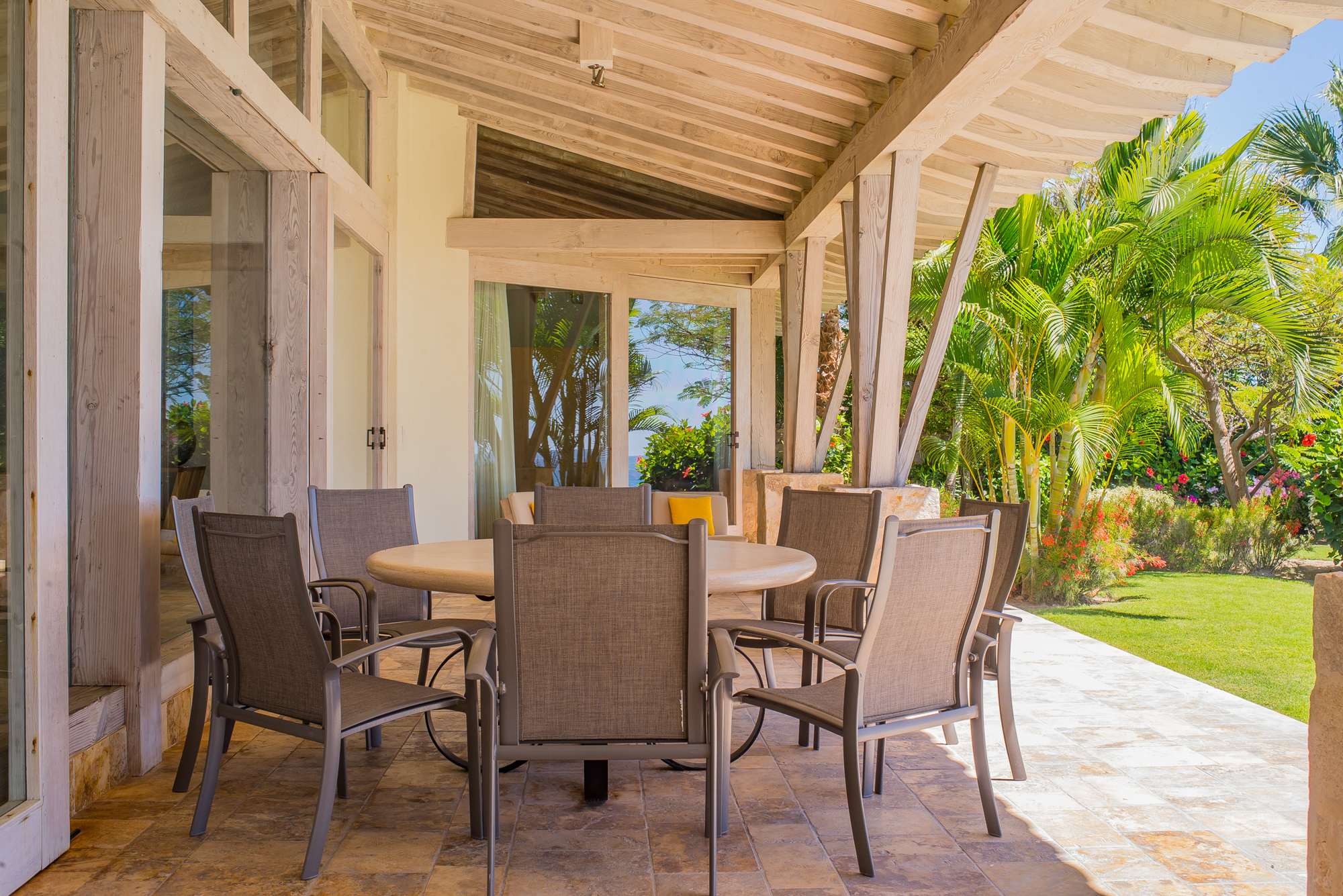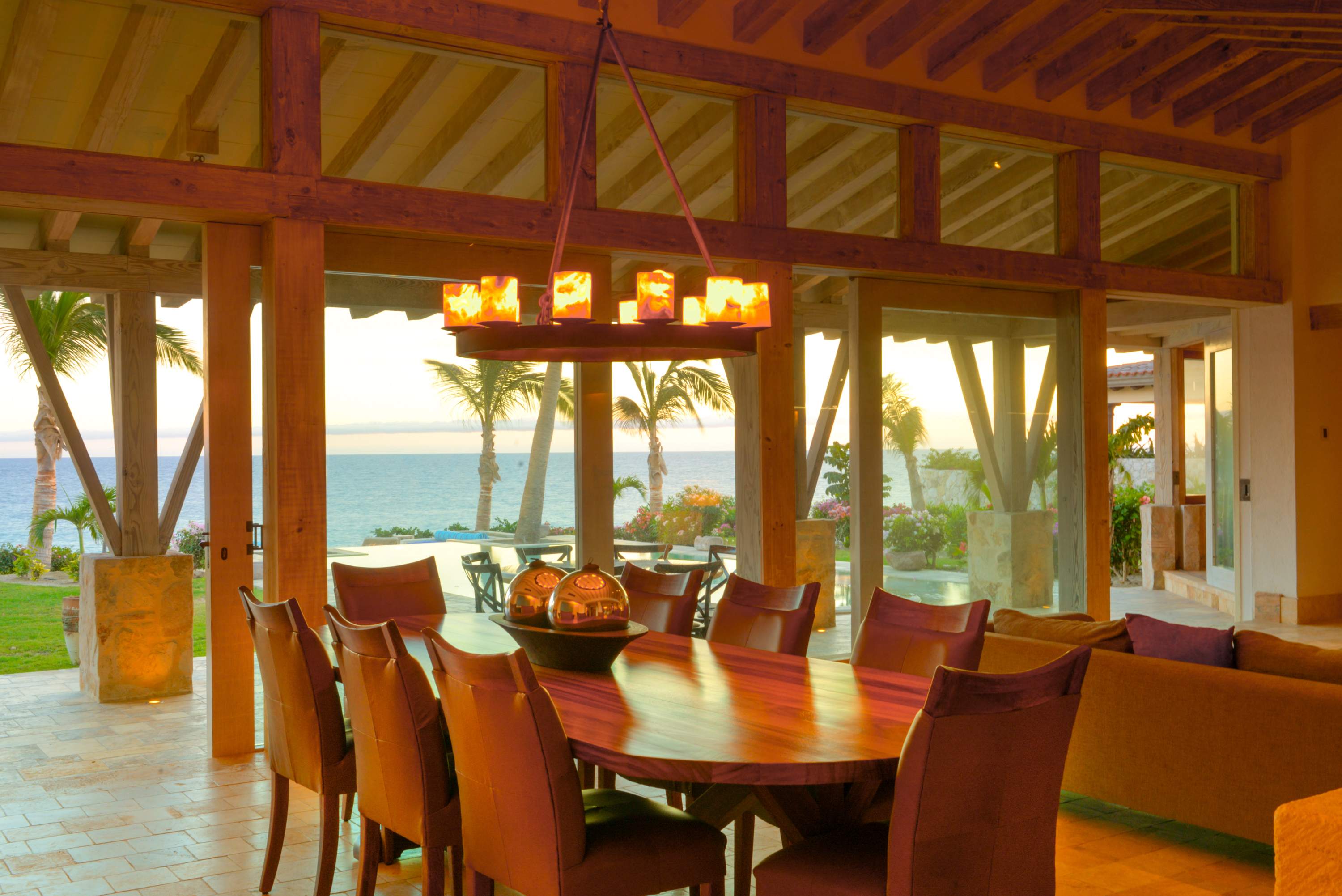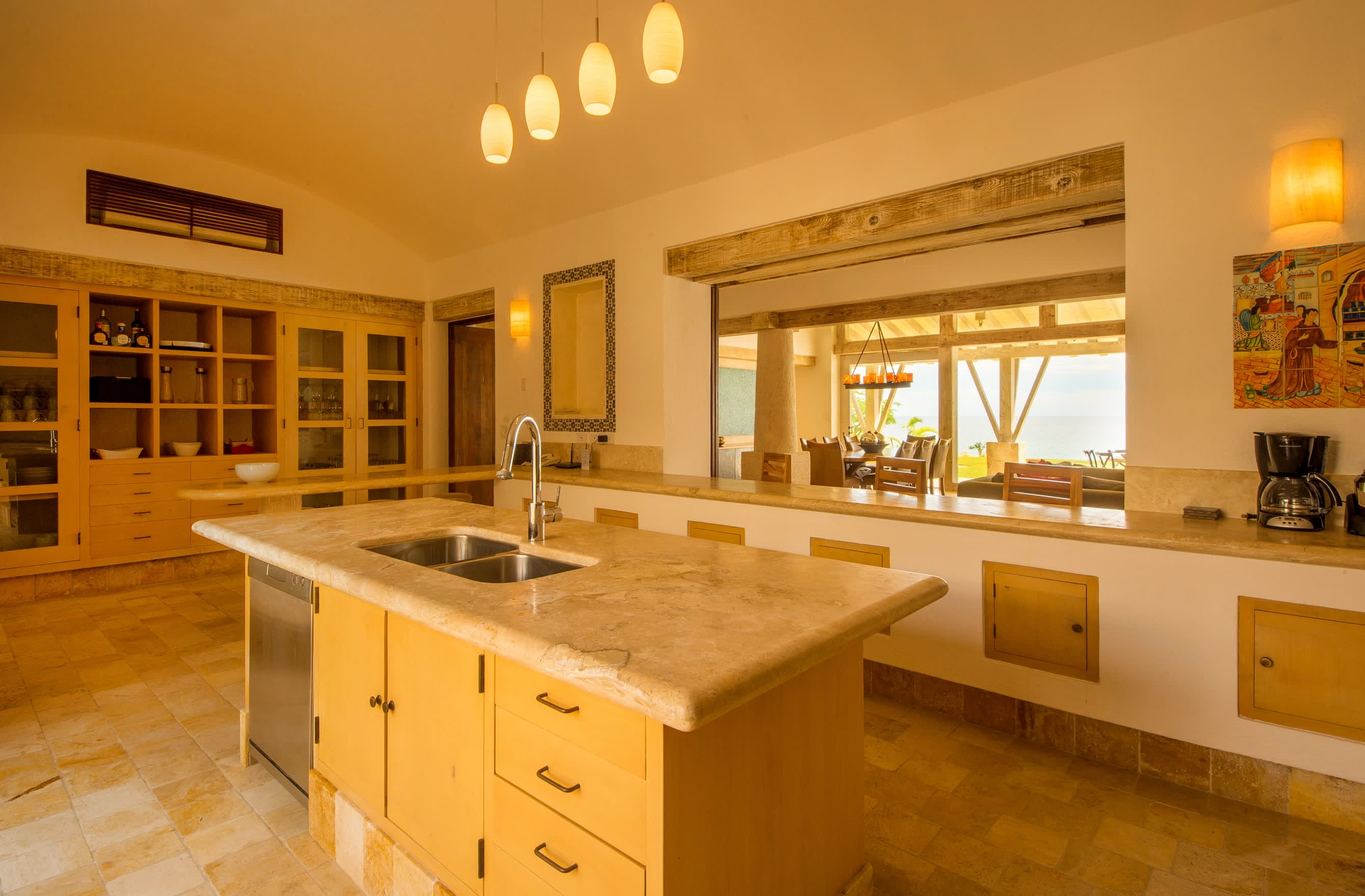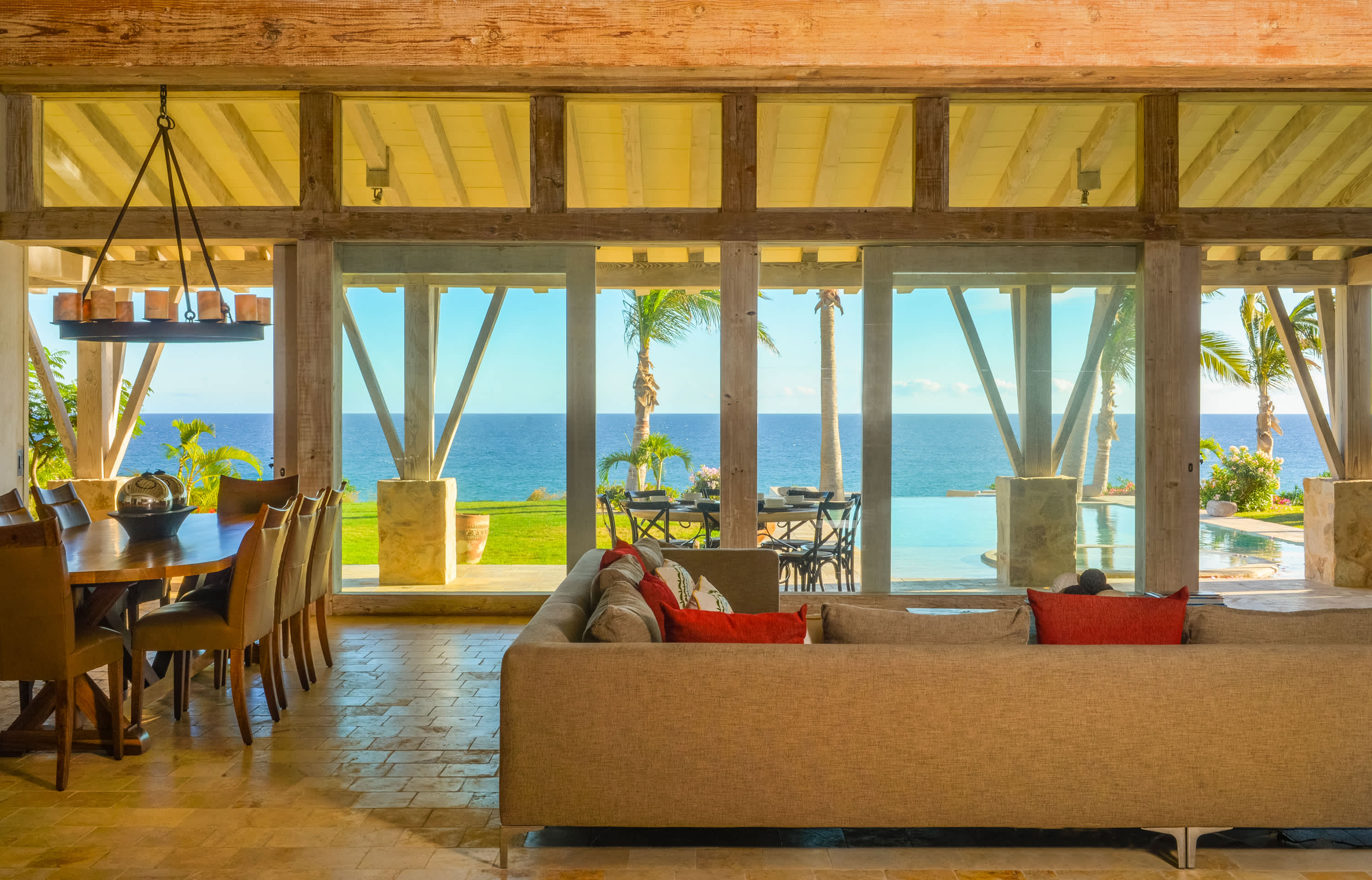 The social heart of the home—the living, dining, and gourmet kitchen—flows through an expansive, open-concept design. Casa Piedra Blanca is bathed in natural light and sea breezes, thanks to a floor-to-ceiling glass wall that spans the entire length of the villa.